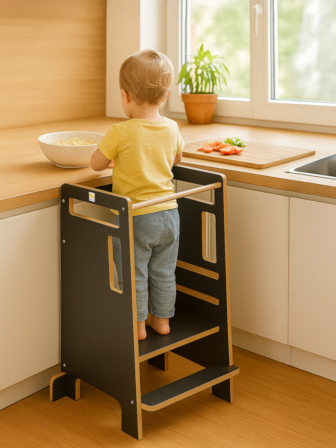 Gefertigt aus hochwertigem MDF mit abgerundeten Kanten bietet der Lernturm ein angenehmes Griffgefühl und höchste Sicherheit. Robust, langlebig und leicht zu reinigen begleitet er Dich und Dein Kind viele Jahre lang – ab dem ersten Geburtstag bis weit darüber hinaus. Gemeinsam Kochen, Zuschauen und Mithelfen wird so zu einem sicheren, spielerischen Erlebnis für die ganze Familie.